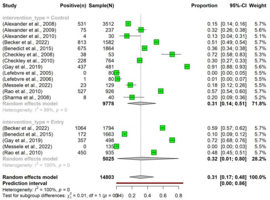 The overall pooled prevalence of tetracycline resistance in E. coli isolated from beef cattle without intervention was 0.31 (95% Confidence Interval (CI): 0.17–0.48). Notably, there was no significant difference in the prevalence between the ‘Entry’ (0.32, 95% CI: 0.01–0.80) and ‘Control’ (0.31, 95% CI: 0.14–0.51) subgroups (Figure 3).