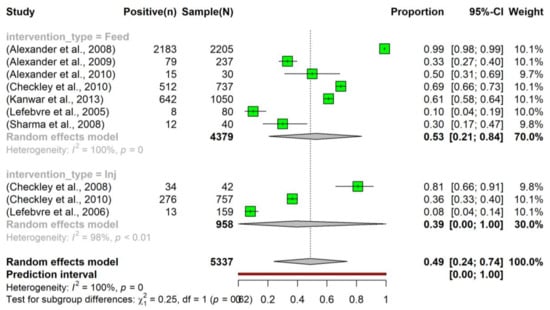 The pooled prevalence of tetracycline resistance in E. coli isolated from beef cattle that had been administered tetracycline in feed was slightly higher (0.53, 95% CI: 0.21–0.84) compared to those that had received tetracycline via injection (0.39, 95% CI: 0.00–1.00). Moreover, considering all interventions, the overall pooled prevalence of tetracycline resistance (0.49, 95% CI: 0.24–0.74) was higher than the prevalence observed in the control group (0.31, 95% CI: 0.01–0.80) (Figure 4). Despite the observed slight increase, the intervention did not have a significant effect on altering the prevalence of tetracycline resistance in E. coli.