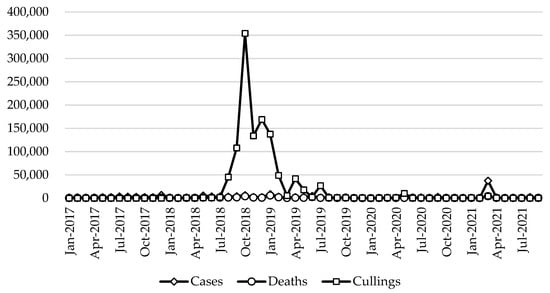 Monthly trends in the pig epidemic (heads), 2017–2021. Data source: Official Veterinary Bulletin, the Ministry of Agriculture and Rural Affairs of the People’s Republic of China.