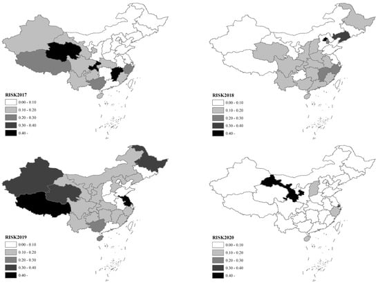 Combined with the basic data, the indices of pig morbidity, mortality and culling rates, breeding density, industrial structure, and prevention and control foundation from 2017 to 2020 were calculated, and the risk of a pig epidemic and its hazard and vulnerability indices were calculated after standardization. Table 3 shows the risk of the pig epidemic and regional distribution obtained based on the mean value of the basic data from 2017 to 2020, and Figure 3 shows the regional distribution of the risk of a pig epidemic from 2017 to 2020. It should be noted that since the risk assessment data were based on the current year’s values, the risk shown in Figure 3 is an annual relative concept that reflects only the current year’s risk distribution and has no size reference value for cross-year comparisons but has reference for the current year’s risk distribution and cross-year risk regional changes.