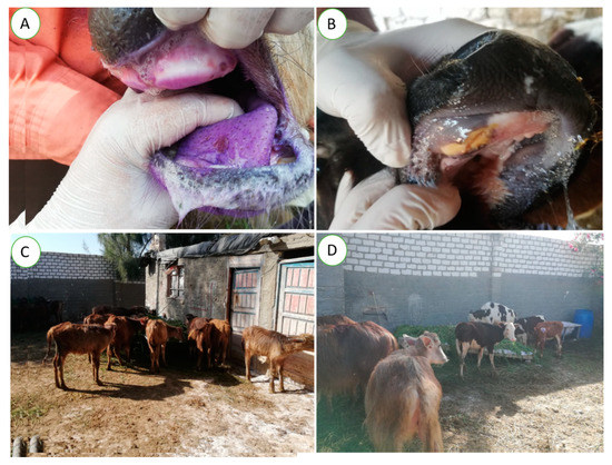 At the beginning of May 2022, several cattle and buffalo farms in the Beheira province suffered from outbreaks of FMD. Therefore, we randomly collected 20 tongue epithelial samples from 20 (10 cattle and 10 buffalo) infected calves in five infected non-vaccinated farms. These farms include both cattle and water buffalo (Bubalus bubalis) calves with ages of less than one year distributed in four districts in the Beheira province, namely, Damanhour, Abu Hommus, Abu Almatamer, and Kafr El-Dawar (Table 1). Regarding the study of clinical and epidemiological parameters associated with FMDV infection, calves from an infected farm in the Abu Almatamer district were fully investigated by veterinarians. In detail, a mixed semi-intensive farm comprised of 70 female animals at 4–6 months of age (35 buffalo and 35 cattle) showed a sudden appearance of clinical symptoms of FMD among the calves. Noticeably, these animals were purchased from the animal markets of Beheira, three months before the onset of clinical symptoms without a history of previous vaccination against FMD. During the outbreak, all calves suffered from high fever, salivation, lameness, vesicular eruption, ulcers on the tongue, gum, and coronets with different degrees of severity (Figure 1), and mortalities in both species. The clinical status and parameters of calves were observed by the veterinarians during the outbreak and for two months after the disappearance of the clinical symptoms. Noticeably, all data and clinical signs shown in this study were obtained from the veterinarians, owners, and the farm’s records.