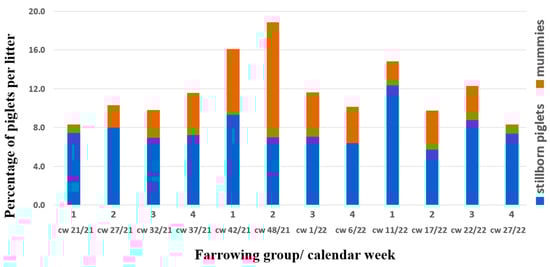 In October 2021, an obvious increase in litters with differently sized mummies and autolysed foetuses, as well as stillborn piglets, was noted by the farmer (group 1, farrowing in calendar week (cw) 42/21, Figure 1).