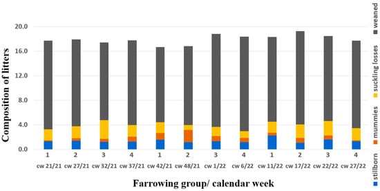 Composition of litters in absolute numbers over time; grey bars show the mean number of weaned piglets, yellow bars show the mean number of suckling losses (piglets that were live-born but died before weaning), blue bars show the mean percentage of stillborn piglets, orange bars show the mean percentage of mummies per farrowing group. Foetal material for diagnostic work-up belonged to group 2 (cw 48/21).