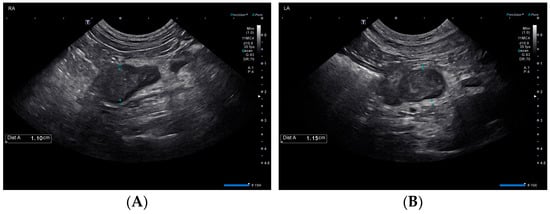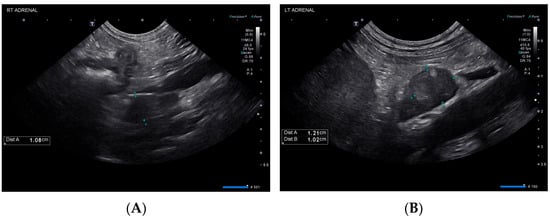 Ultrasonographic findings of the right (A) and left (B) adrenal glands on day 1.