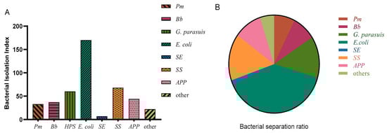 The 169 batches usually included samples from several pigs or samples from multiple parts of a pig, and 526 samples were actually tested. After separation, purification, Gram staining, and PCR amplification, 16 of the tested samples were contaminated and could not be separated and purified, and no bacteria was detected in 89 samples. In the remaining samples, 36 Pasteurella multocida (Pm) isolates were detected, with an isolation rate of 6.84%; 37 Bordetella bronchiseptica (Bb) isolates were detected, with an isolation rate of 7.03%; 60 Glasserella parasuis (G. parasuis) isolates were detected, with an isolation rate of 11.41%; 170 Escherichia coli (E. coli) isolates were detected, with an isolation rate of 32.32%, E. coli isolated in this investigation included ETEC, EPEC, STEC, among which ETEC accounted for the vast majority; 67 Streptococcus suis (SS) isolates were detected, with an isolation rate of 12.74%; 44 Actinobacillus pleuropneumoniae (APP) isolates were detected, with an isolation rate of 8.37%; and 7 Salmonella enteritis (SE) isolates were detected, with an isolation rate of 1.33%(Figure 1A,B). SE was not included in the subsequent statistical analysis due to the small number of isolates.