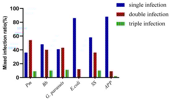 Among the various bacteria isolated, there were single infections, double infections, and triple infections. The numbers of single infections, double infections, and triple infections involving Pm were 12, 20, and 4, and the proportions of these infections were 33.33%, 55.56%, and 11.11%, respectively. The numbers of single infections, double infections and triple infections involving Bb were 18, 15, and 4, and the proportions of these infections were 48.65%, 40.54%, and 10.81%, respectively. The numbers of single infections, double infections and triple infections of G. parasuis were 26, 27 and 7, and the proportions of these infections were 43.33%, 46%, 11.67%, respectively. The numbers of single infections, double infections, and triple infections involving E. coli were 142, 27, and 1, and the percentages of these infections were 78.89%, 15%, and 0.56%, respectively. The numbers of single infections, double infections and triple infections involving SS were 36, 25, and 6, and these infections accounted for 53.73%, 37.31%, and 8.96%, respectively. The numbers of single infections, double infections and triple infections involving APP were 38, 5, and 1, and the percentages of these infections were 88.64%, 9.09%, and 2.27%, respectively. SS and G. parasuis accounted for the largest number of mixed infections, identified in 15 samples. The second largest number of mixed infections (10) involved Bb and G. parasuis (Table 3 and Table 4, Figure 2).