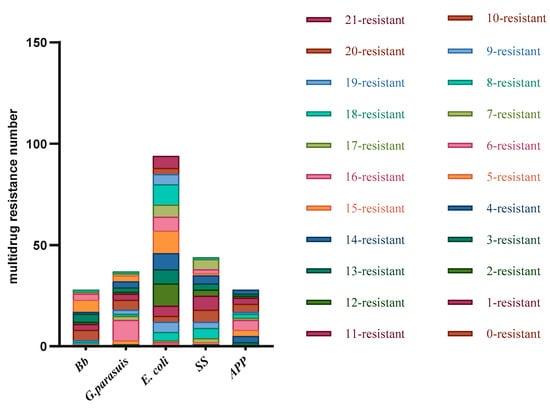 Among the 18 strains of Pm that were subjected to disc diffusion testing, 6 strains were resistant to 0–5 drugs, accounting for 33.33%; 11 strains were resistant to 6–10 drugs, accounting for 61.11%; 1 strain was resistant to 12 drugs, accounting for 5.56%; and no strains resistant to 16–20 or 21 drugs. Among the 28 Bb strains tested, 1 strain was resistant to 0–5 drugs, accounting for 3.57%; 7 strains were resistant to 6–10 drugs, accounting for 25%; 15 strains were resistant to 15 drugs, accounting for 53.57%; 5 strains resistant to 16–20 drugs, accounting for 17.86%; and no strains were resistant to 21 drugs. Among the 36 strains of G. parasuis tested, 3 strains were resistant to 0–5 drugs, accounting for 8.33%; 20 strains were resistant to 6–10 drugs, accounting for 55.56%; 12 strains were resistant to 11–15 drugs, accounting for 33.33%; 2 strains were resistant to 16–20 drugs, accounting for 5.56%; and no strains resistant to 21 drugs. Among the 94 E. coli strains tested, 1 strain was resistant to 0–5 drugs, accounting for 1.06%; 14 strains were resistant to 6–10 drugs, accounting for 38.89%; 11–15 strains were resistant to 42 drugs, accounting for 44.68%; 31 strains were resistant to 16–20 drugs, accounting for 32.98%; and 6 strains were resistant to 21 drugs, accounting for 6.38%. Among the 44 strains of SS tested, 2 strains were resistant to 0–5 drugs, accounting for 4.55%; 16 strains were resistant to 6–10 drugs, accounting for 36.36%; 18 strains were resistant to 11–15 drugs, accounting for 40.91%; 8 strains were resistant to 16–20 drugs, accounting for 18.18%; there were no strains resistant to 21 drugs. Among the 28 APP strains tested, 8 strains were resistant to 0–5 drugs, accounting for 28.57%; 13 strains were resistant to 6–10 drugs, accounting for 29.55%; 7 strains were resistant to 11–15 drugs, accounting for 15.91%; and there were no strains resistant to 16–20 or 21 drugs. The experimental results revealed that none of the isolated strains were resistant to 0 or 1 antibiotic. Pm had the best overall sensitivity, and E. coli had the highest rate of drug resistance. All the bacteria except for E. coli were resistant to 19 or more drugs; E. coli had resistance to 19 or more drugs, and 6 strains were resistant to all 21 drugs (Table 11, Figure 3).