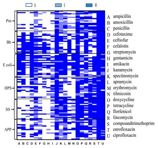 Among the Pm, Bb, G. parasuis, E. coli, SS, and APP isolates that were tested with the disc diffusion method, 18 were randomly selected for construction of a heatmap of resistance to 21 antibiotics (Figure 4). The results showed that E. coli was most resistant to several antibiotics. Pm and SS were similar in their sensitivity rates, and both were sensitive to antibiotics A, B, C, D, E, F, G, H, and I. Four antibiotics, trimethoprim, tilmicosin, apramycin, and lincomycin, had the highest associated resistance rates, which may be related to the high rates of use of these antibiotics on pig farms. Pm, G. parasuis, SS, and APP had similar drug resistance patterns. Most of these bacterial specimens were collected from the lungs, and the resistance patterns may be related to the sample collection site.
