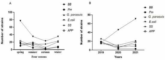The experimental results revealed that Pm, Bb, G. parasuis, E coli, SS, and APP were widespread in Zhejiang, similar to previous reports [] in China, though the bacterial isolation rates were different. For example, a previous report [,] showed that the isolation rate of SS in Thailand was very high, but the isolation rate of SS in this investigation was very low. This result may be caused by comprehensive factors, such as different regional characteristics, sample sources, and climates. The bacteria in this study can be divided into two categories, intestinal bacteria and respiratory bacteria, and infections caused by these bacteria can seriously affect the Chinese pig industry. Therefore, research on the isolation rates, drug resistance patterns, and seasonality of these bacteria is of great significance for the prevention and control of local bacterial diseases.