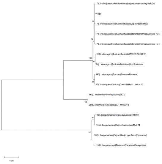 Serological test for leptospirosis carried out on the serum of the sick puppy showed antibodies against L. interrogans serogroup Icterohaemorragiae serovar Copenhageni (titer of 400). Also, a reaction against L. interrogans serogroup Grippotyphosa serovar Grippotyphosa was observed (titer of 200). Urine samples were found to be negative for pathogenic Leptospira spp. DNA.