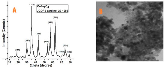 (A) XRD result showing phase identification patterns of CoFe2O4; (B) TEM images of CoFe2O4.