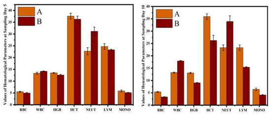 Comparison of hematological profile of normal and cobalt iron oxide (CoFe2O4) nanoparticles (CIONPs)-treated rabbits at (A) day 5 and (B) day 10.