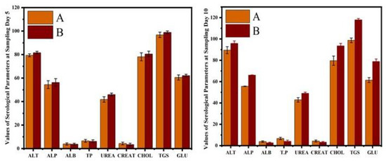 Comparison of serum biochemistry profile of normal and cobalt iron oxide (CoFe2O4) nanoparticles (CIONPs)-treated rabbits at (A) day 5 and (B) day 10.
