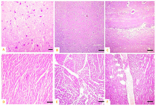 Photomicrograph of (A) normal brain of control; (B,C) cobalt iron oxide (CoFe2O4) nanoparticles (CIONPs)-treated rabbits exhibiting necrosis, atrophy, and degeneration of neurons in cerebellum, congestion, and microgliosis in brain sections; (D) normal heat of control; (E,F) disorganization of myocardial fibers, necrosis of cardiac myocytes, edema, disorganization of cardiac muscles and congestions.
