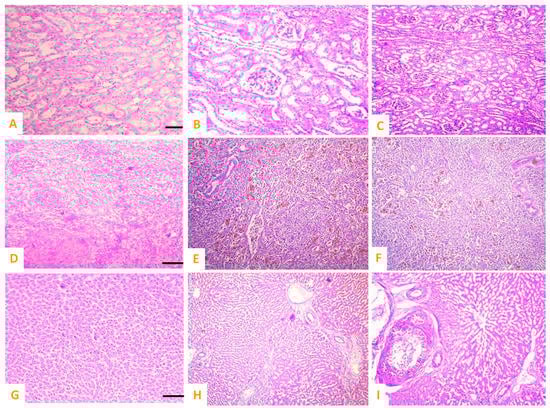 Photomicrograph of (A) normal kidneys of control group, cobalt iron oxide (CoFe2O4) nanoparticles (CIONPs)-treated rabbits exhibiting (B,C) necrosis and increased urinary spaces, epithelial detachment from the tubular basement membrane, necrosis of renal tubules and deposition of casts in the lumen of renal tubules in kidneys; (D) normal spleen of control; (E,F) red pulp showing scattered lymphocytes, deposition of ceroid, depletion of white pulp and increased red pulp, and (G) normal hepatocytes of control group; (H,I) cytoplasmic vacuolation, disorganized hepatic cord, edema, and necrosis of hepatic nuclei.