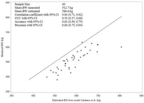Again, with the help of Lin’s CCC method, we used the data of the BW to evaluate the accuracy and precision of models from the literature, such as the model of Catalano et al. [] and that of Kienzle and Schramme []. Figure 3 indicates the measures of accuracy (63%) and precision (84%) of the prediction of BW of the model by Catalano et al. []. The mean CCC of the model as a measure of reproducibility was 0.53, only moderate.