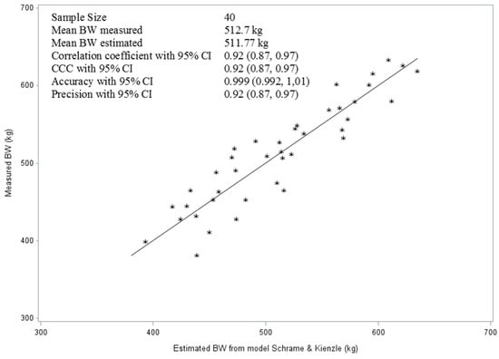 Figure 4 indicates the measures of accuracy (99.9%), which were higher than the precision (92%) in the prediction of BW, based on the model by Schramme and Kienzle []. Lin’s CCC, as a measure of the reproducibility of this model, was also 0.92. By comparing the actual BW with the scale and the calculated BW using the model of Schramme [], the result showed that in 60% (n = 24) of the horses the BW was underestimated, meaning the result of the calculated BW was lower than the actual one. The mean value was −18.5 kg and the span reached from −47 to −1 kg of the actual BW. In 35% (n = 14) of the animals, the BW was overestimated by the mean of +29.1 kg and a span from +6 to +58 kg. Only in 5% of animals were the actual and calculated values exactly the same.