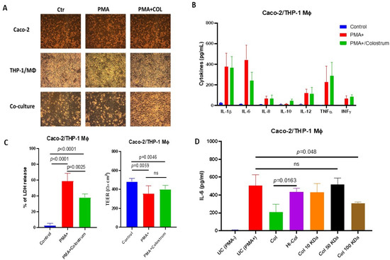 Figure 1. Bovine colostrum exerts immunomodulatory and chemoprotective activity on the Caco-1/THP-1 macrophage co-culture system. Panel (A) shows the morphological changes of Caco-2, THP-1, and co-cultures during the stimulation with Phorbol 12-myristate 13-acetate (PMA) and treatment with bovine colostrum (COL). Scale bar represents 100 µm. Panel (B) shows the effects of bovine colostrum on PMA-induced cytokine production by Caco-2/THP-1 macrophage co-culture. Panel (C) shows the effects of bovine colostrum on PMA-induced LDH release and transepithelial electric resistance (TEER) changes. Panel (D) demonstrates the effect of various treatments of bovine colostrum on the ability to suppress IL-6 production by Caco-2/THP-1 cells. Data are shown as mean ± standard deviation (SD). ns—non-significant.