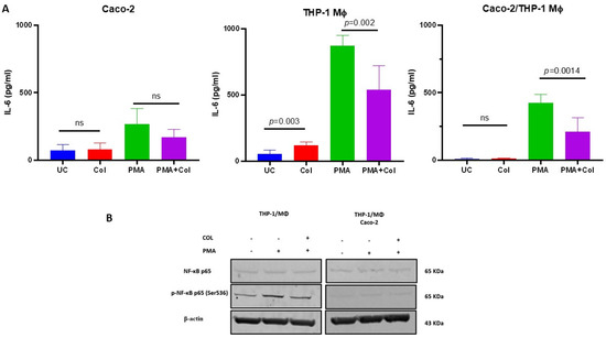 Figure 2. Bovine colostrum is able to reduce IL-6 production via THP-1-derived macrophage modulation. Panel (A) shows the effects of COL treatment on PMA-induced IL-6 production by Caco-2, THP-1 derived macrophages or their co-cultures. Panel (B) shows Western blots for NF-κB from THP-1-derived macrophages and Caco-2 co-culture. Data are shown as mean ± standard deviation (SD).