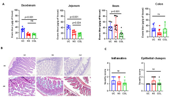 Figure 3. Bovine colostrum decreases intestinal permeability and infiltration with immune cells in calf-FMT C57BL/6 mice. Panel (A) demonstrates the intestinal permeability and inflammation measured by Evans blue assay. Panel (B) shows representative photomicrographs of the mouse intestine stained with hematoxylin/eosin (HE) and Alcian blue (AB). Panel (C) shows the pathological scoring of calf-FMT C57BL6 mice undergoing feeding with normal saline (NS) and colostrum (COL). Data are shown as mean ± standard deviation (SD).