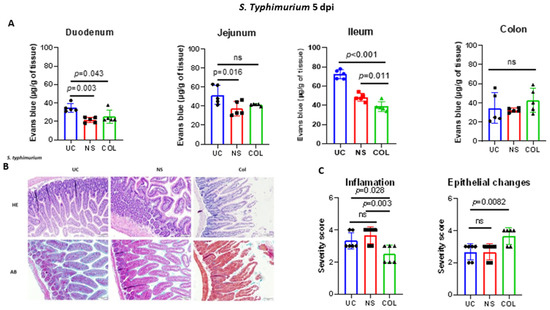 Figure 4. Bovine colostrum reduces intestinal inflammation in calf-FMT C57BL/6 mice lethally challenged with S. typhimurium ATCC 14028 strain. Panel (A) demonstrates the intestinal permeability and inflammation measured by Evans blue assay followed by lethal challenge with S. typhimurium ATCC 14028. Panel (B) shows representative photomicrographs of S. typhimurium infected calf-FMT C57BL/6 mouse intestine stained with hematoxilin/eosin (HE) and Alcian blue (AB). Panel (C) shows the pathological scoring of Salmonella-infected calf-FMT C57BL6 mice undergoing feeding with normal saline (NS) and colostrum (COL). Data are shown as mean ± standard deviation (SD).