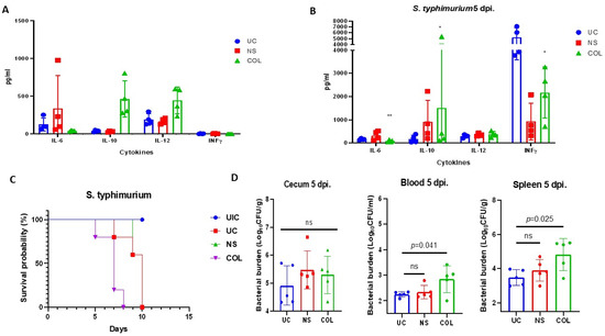 Figure 5. Bovine colostrum exhibits IL-6-targeted anti-inflammatory effects and mitigates S. typhimurium ATCC 14028 infection in calf-FMT C57BL/6 mice. Panel (A) illustrates cytokine production in calf-FMT C57BL/6 mice subjected to colostrum feeding. Panel (B) displays cytokine production in response to a lethal challenge with the S. typhimurium ATCC 14028 strain. Panel (C) presents survival data of calf-FMT C57BL/6 mice following a lethal challenge with S. typhimurium ATCC 14028, with interventions involving normal saline (NS), colostrum (COL), untreated Salmonella-challenged control, or calf-FMT transplanted and non-infected mice. Panel (D) demonstrates the Salmonella bacterial burden subsequent to the lethal challenge and feeding with NS or COL. Data are shown as mean ± standard deviation (SD). * p < 0.05; ** p < 0.001.