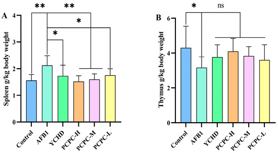 The relative weight of the spleen and thymus of the immune organs. The protective effect of PCPC on spleen and thymus in broiler chickens fed a feed containing AFB1. Results were expressed as mean ± SD. (A) Spleen; (B) Thymus. (* p < 0.05, ** p < 0.01; and non-significant (ns) p > 0.05).