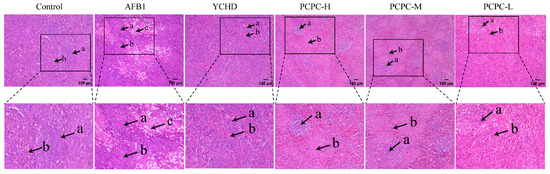 The spleen is the body’s most important secondary immune system and increased spleen weight is used as a marker for the severity of inflammation. The thymus is defined as a primary lymphoid organ, which plays a significant role in the immune system development and differentiation. Relative organ weight was calculated as an absolute organ weight (g)/body weight on sacrifice day (g) × 100. The organs of 30 animals per group were examined. Compared with the control group, the relative organ weight of the spleen in the AFB1 group increased markedly (p < 0.01), while no significant enlargement was noted in all treated groups, especially in the PCPC-H group. Increased spleen weight in the AFB1 group may be associated with the expansion of the red and white pulp. The relative weight of thymus organs in the AFB1 group decreased significantly (p < 0.05). There was a tendency for improvement in all treatment groups, especially in the PCPC-H group (Figure 1). The relative weight of the organ thymus of the model group was significantly reduced as compared to the control group, while the relative weight of the spleen was remarkably increased, indicating that AFB1 could destroy immune organs. YCHD and PCPC, especially PCPC-H, could effectively protect the thymus and spleen from AFB1 in broiler chickens.
