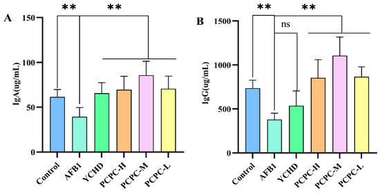 The level of serum immunoglobulin in AFB1-induced immune imbalance in broiler chickens. Results were expressed as mean ± SD. (A) IgA; (B) IgG. (** p < 0.01; and non-significant (ns) p > 0.05).