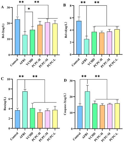 Apoptotic protein expression was analyzed by ELISA (Figure 5). AFB1 significantly decreased Bcl-2 and Bcl-xl (p < 0.01) and increased Bax and Caspase-3 protein levels (p < 0.01). On the other hand, the administration of PCPC significantly suppressed the expressions of Bcl-2 and Bcl-xl and increased the expressions of Bax and Caspase-3. In general, apoptosis is controlled by pro-apoptotic (Bax) and anti-apoptotic (Bcl-2 and Bcl-xl) proteins and is carried out through Caspase (Caspase-3). It was noted that AFB1 promoted apoptosis in the spleen. PCPC has been found to modulate apoptosis via Bax/Bcl-2/Caspase-3, showing protective effects by regulating Bcl-2/Bax ratio and reducing Caspase-3 expression.