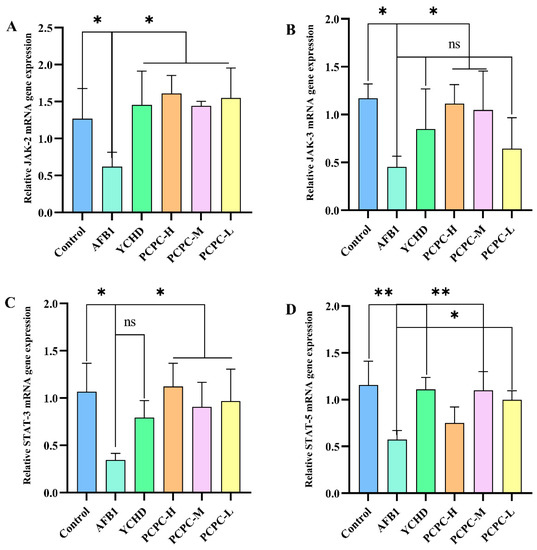 Protective effects of PCPC on apoptosis due to AFB1 by interfering with the JAK/STAT pathway. The JAK/STAT-associated gene mRNA expression was analyzed by real-time quantitative PCR (qPCR). Relative mRNA result expressed as mean ± SD. (A) JAK2, (B) JAK3, (C) STAT3 and (D) STAT5. (* p < 0.05, ** p < 0.01, non-significant (ns) p > 0.05).