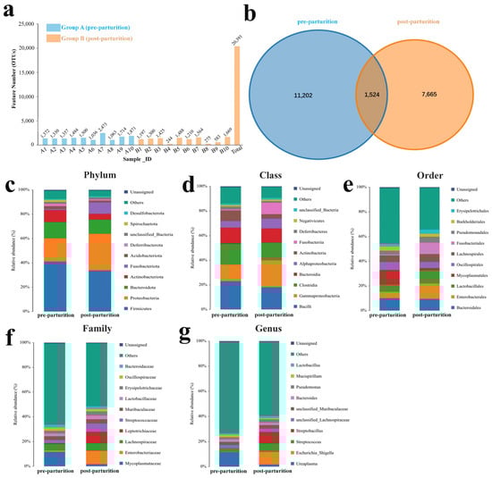 Composition analysis of microbiota in the birth canal of Bangor Sewa Sheep. (a) Distribution of OTUS in each sample. (b) Venn map. OTUS. Compare the composition of microbiota at (c) phylum, (d) class, (e) order, (f) family, and (g) genus levels. A1–A10 represent samples from the pre-parturition group, and B1–B10 are samples from the post-parturition group.