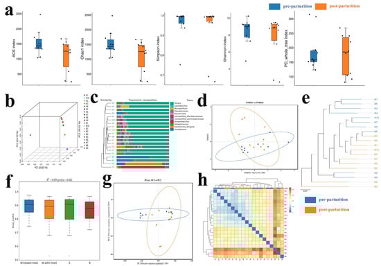 To further characterize microbial compositions in Bangor Sewa sheep, we compared the microbiota structure between pre- and post-parturition groups. The alpha diversity index analysis indicated that microbiota in the two groups did not appear to differ significantly; however, microbiota in pre-parturition had slightly higher ACE and Chao 1 indices (Figure 2a and Figure S2, Table S2). Beta diversity analysis showed that although no significant difference in the sample cluster was found, the two sheep groups had a little bit of distinction (Figure 2b–h).