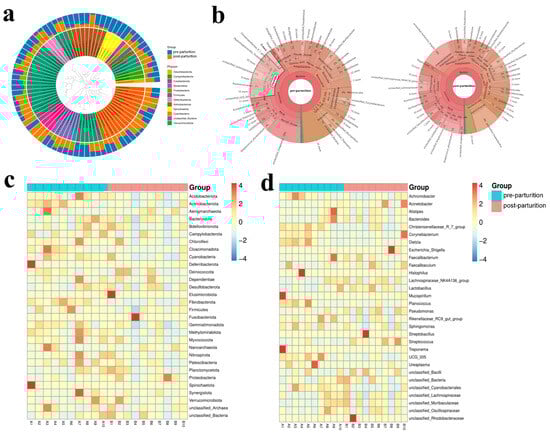 Compared to the pre-parturition group, the microbiota in the post-parturition group had higher levels of Deferribacterota, Firmicutes, Desulfobacterota, Fusobacteriota, Bacteroidota, Proteobacteria, and Verrucomicrobiota while having lower levels of Spirochaetota, Cyanobacteria, and Actinobacteriota at phylum level according to the evolutionary tree analysis (Figure 3a). The KRONA analysis showed that the genus with the highest abundance was unclassified_Ureaplasma (12%), followed by unclassified_Lachnospiraceae (3%), Streptococcus_pluranimalium (2%), Ruminococcaceae (2%), Histophilus_somni (2%), unclassified_Muribaculaceae (2%), Prevotellaceae (2%), unclassified_Mucispirillum (2%), and unclassified_Treponema (2%) in the pre-parturition group, while unclassified_Escherichia_Shigella (10%), unclassified_Streptobacillus (9%), Burkholderiales (3%), unclassified_Muribaculaceae (3%), unclassified_Pseudomonas (2%), and Prevotellaceae (2%) were the dominant genera in the post-parturition group (Figure 3b). Furthermore, the clustering heat map of species abundance indicated that compared with the post-parturition group, the phylum abundance of Actinobacteriota, Campylobacterota, Cloacimonadota, Cyanobacteria, Fibrobacterota, and Spirochaetota were higher, while the levels of Fusobacteriota and Proteobacteria were lower in the pre-parturition group (Figure 3c). At the genera level, the abundance of Achromobacter, Christensenellaceae_R_7_group, Corynebacterium, Dietzia, Histophilus, Planococcus, Treponema, UCG_005, and Ureaplasma was higher, whereas Acinetobacter, Escherichia_Shigella, Faecalibaculum, Streptobacillus, and unclassified_Rhodobacteraceae were lower in the pre-parturition group compared with the post-parturition group (Figure 3d).