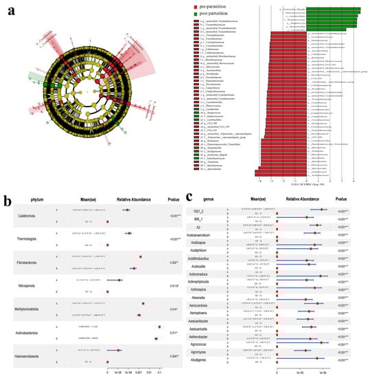 Microbes significantly altered between the two groups of Bangor Sewa sheep are analyzed via LEfSe (a) and Metastats at the phylum (b) and genus (c) levels. A represents the pre-parturition group, and B represents post-parturition group. Significance is presented as * p < 0.05; ** p < 0.01; *** p < 0.001. Data are presented as the mean ± SEM (n = 10).