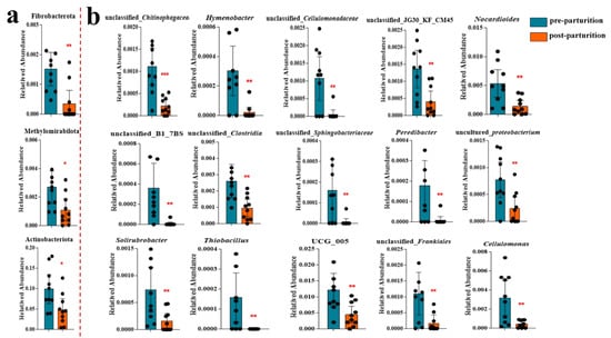 In addition, we also found that, compared to the pre-parturition group, microbiota in the post-parturition group had a higher abundance of g_Lactobacillus, g_Streptococcus, f_Streptococcaceae, o_Lactobacillales, g_Streptobacillus, g_Escherichia_Shigella, and f_Enterobacteriacea (Figure 4a). On the contrary, a subset of species had lower abundance, including g_unclassified_Vicinamibacteraceae, f_Vicinamibacteraceae, g_unclassified_Vicinamibacterales, f_unclassified_Vicinamibacterales, o_Vicinamibacterales, g_Corynebacterium, f_Corynebacteriaceae, o_Corynebacteriales, g_Cellulomonas, f_Cellulomonadaceae, g_unclassified_Microbacteriaceae, f_Microbacteriaceae, g_unclassified_Micrococcaceae, o_Micrococcales, g_Aeromicrobium, g_Nocardioides, f_Nocardioidaceae, o_Propionibacteriales, g_Flavobacterium, g_Campylobacter, f_Campylobacteraceae, g_unclassified_Cyanobacteriales, f_unclassified_Cyanobacteriales, o_Cyanobacteriales, f_Planococcaceae, g_UCG_005, g_unclassified_UCG_010, f_UCG_010, g_unclassified_Eubacterium_coprostanoligenes_group, f_Eubacterium_coprostanoligenes_group, g_Romboutsia, o_Peptostreptococcales_Tissierellales, f_Alcaligenaceae, g_Treponema, f_Spirochaetaceae, and o_Spirochaetales after delivery, according to LEfSe analysis (Figure 4a). Metastats discovered that the phyla of Calditrichota, Thermotogota, Fibrobacterota, Nitrospinota, Methylomirabilota, Actinobacteriota, and Halanaerobiaeota notably decreased after delivery in the birth canal of the Bangor Sewa sheep (Figure 4b). Additionally, the abundance of Acetoanaerobium, Acidiphilium, Acidocella, Actinophytocola, Actinospica, and other genera markedly declined in the post-parturition group compared to the pre-parturition group, whereas the genera of Acidicapsa, Acidithiobacillus, Actinomadura, Advenella, and Aetherobacter were elevated after delivery (Figure 4c).