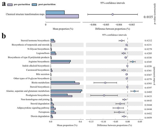 To explore the changes in microbial-related biological functions, we made predictions in a variety of ways. KEGG function predictions found that there were 2, 2, and 23 distinctly different metabolic pathways between two groups at level 1, level 2, and level 3, respectively (Table S3). Although no significantly different functions were discovered between the two groups of Bangor Sewa sheep using BugBase, five obviously different abundant functions were found according to FAPROTAX (Table S4). There was no appreciable difference in the Tax4Fun function at level 1, while the chemical structure transformation map function was noticeably greater at level 2 in the pre-parturition group than that in the post-parturition group (Figure 6a). Furthermore, a series of functions showed obviously different between two groups, indicating that the changed microbes induced multiple functional differences, including steroid hormone biosynthesis, the biosynthesis of terpenoids and steroids, N-glycan biosynthesis, legionellosis, the biosynthesis of type II polyketide products, arginine biosynthesis, indole alkaloid biosynthesis, carotenoid biosynthesis, bile secretion, other types of O-glycan biosynthesis, biotin metabolism, steroid biosynthesis, alanine, aspartate and glutamate metabolism, prodigiosin, non-homologous end-joining, steroid degradation, adipocytokine signaling pathway, ferroptosis, and dioxin degradation (Figure 6b).