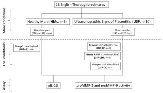 Schematic diagram of the study design. According to the conditions of the mares, they were classified as healthy mares (HM; n = 6), or mares with ultrasonographic signs of placentitis (USP; n = 10). In each case, the health of the neonatal foal was evaluated, and they were subclassified into four groups: HM-HF (n = 6), USP-HF (n = 3), USP-LSeF (n = 4), and USP-DF (n = 3). The quantification of eIL-1β and the activity of proMMPs was evaluated in the serum from mares at 240 and 320 days of gestation.