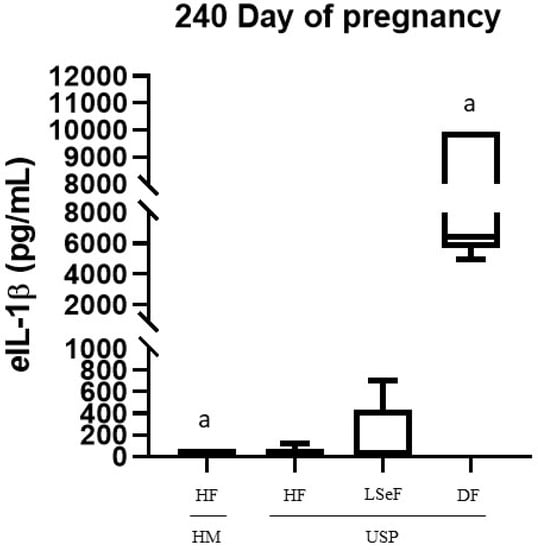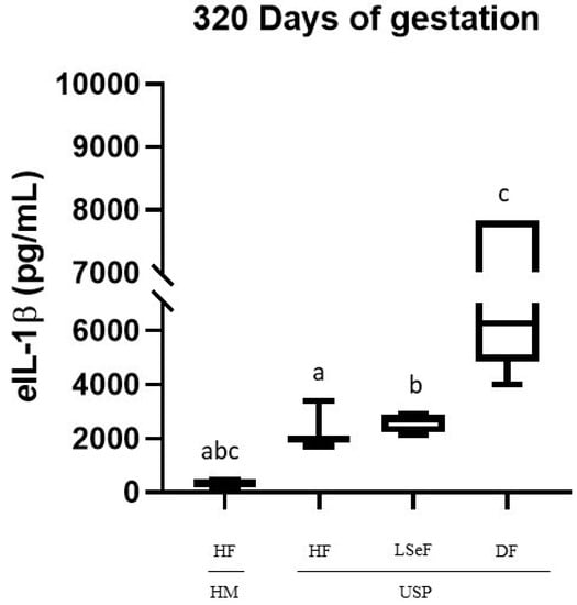 On day 320 of pregnancy, the concentration of eIL-1β was significantly different between the groups of HM-HF and USP-HF (p = 0.0002), and between mares in the USP group that delivered a live septic foal (HM vs. USP-LSeF, p = 0.0006) and those who delivered a dead foal (HM vs. USP-DF, p < 0.0001). All showed significantly high levels of eIL-1β (Figure 3).