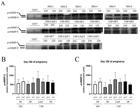 On day 240 of pregnancy, the level of proMMP-9 activity was 573.2 ± 209.6 (relative D.O units) in the HM-HF group and 1.06-fold lower in mares with the USP group that delivered a healthy foal (HF vs. USP-HF, p = 0.9999; Figure 5B). Comparing the HM-HF to the USP group that delivered a live septic foal, an increment of 1.4-fold was found (HM-HF vs. USP-LSeF, p = 0.7143), and when the HM-HF group was compared to the USP group that delivered a dead foal, a 1.12-fold increase was found, (HM-HF vs. USP-DF, p = 0.9999).