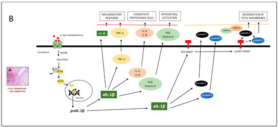 Model of the effect of eIL-1β and proMMP-9 in mares with placentitis. (A) Histological section of equine placental inflammation is illustrated. (B) According to the model, TOLL-like receptors (TLR-2 and TLR-7) [23,24] recognize different pathogen-associated molecular patterns (PAMPs), such as flagellin, lipoproteins, LPS, DNA, and RNA [22]. They then induce the phosphorylation of IRAK/TRAF, which [24] activates the nuclear factor kappa-light-chain-enhancer of activated B cells (NFĸB), facilitating the transcription of eIL-1β [26]. The latter has been associated with the inflammatory response (TNFα) [27,28] and chemotactic cytokines (IL-6, IL-8). These molecules amplify the inflammatory response by recruiting professional antigen-presenting cells of the immune system [46,47,50]. The inflammatory response stimulates the synthesis of prostaglandin (PGE) and oxytocin, which, together, initiate uterine contractions. In the next phase of the inflammatory response, eIL-1β triggers the activation of proMMP-2 and proMMP-9 [40], leading to the degradation of different structures of the fetal membranes. This results in the weakening of the tensile strength of these membranes, and therefore, the onset of premature labor [49,52].