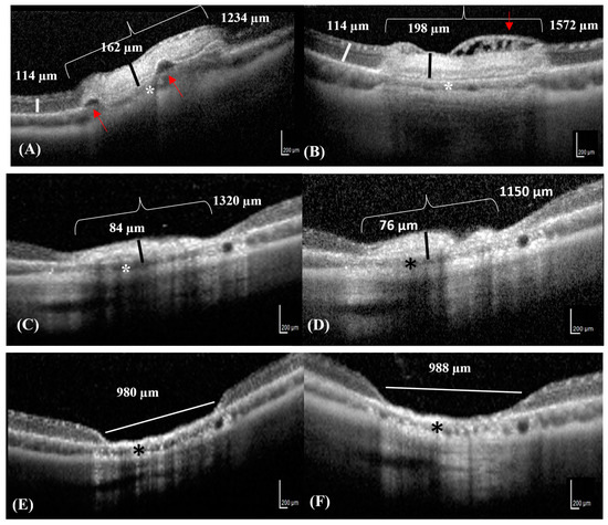 SD-OCT images of the same lesion progressing over time in a rabbit. (A) The OCT image reveals focal serous retinal detachments (red arrows) in an area of neuroretinal edema (bracket) on D0. The thickness of the neuroretinal edema (black line) contrasts with that of the adjacent healthy neuroretinal tissues (white line). (B) The OCT image reveals diffuse retinal edema with small superficial nerve fiber bullae, appearing as hypo-reflective intraretinal cysts (cystoid retinal edema) (red arrow) on D1. (C,D) The photocoagulation lesion appears hyper-reflective with decreased neuroretinal thickness and resolving retinal edema (black lines) on D7 and D15, respectively. (E,F) The retina Is completely atrophic and reduced to 1/10th of its original thickness (white line) on D21 and D42. (A–F) The choroid is slightly reduced in thickness in all Figures (asterisks).