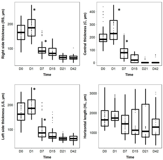 Significant differences were observed between the RS, C, and LS thicknesses (LMM: p < 0.001) over time. However, HL did not vary significantly over time (p = 0.584) (Figure 3). The RS, C, and LS thicknesses were significantly affected by time and presented a similar pattern; there was no significant difference between D0 and D1 (p > 0.05) (Figure 3). However, the three measures of thickness decreased significantly between D1 and D7 (p < 0.001) and were significantly lower on D7, D15, D21, and D42 than on D0 or D1 (p < 0.001 for all comparisons) (Figure 3). No significant differences were observed between D7, D15, D21, and D42 (p > 0.05) (Figure 3).