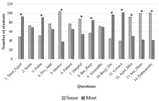 - Maleki, F.; Talaei, M.H.; Moghadam, S.R.M.; Shadigo, S.; Taghinejad, H.; Mirzaei, A. Investigating the Influence of Teachers’ Characteristics on the Teacher-Student Relations from Students’ Perspective at Ilam University of Medical Sciences. J. Clin. Diagn. Res. 2017, 11, JC04–JC08. [Google Scholar] [CrossRef] [PubMed]