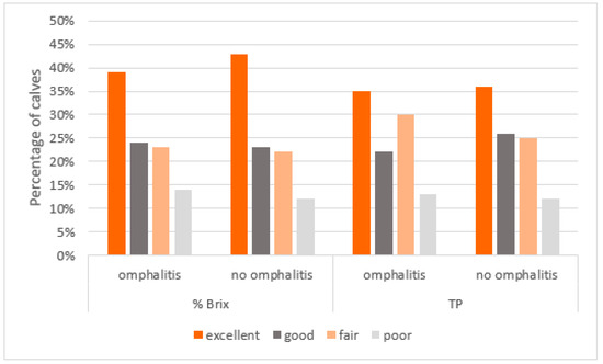 Distribution of the quality of TPI (evaluated by % Brix or TP measurement) in calves with or without omphalitis.