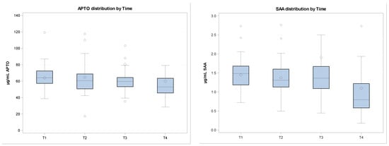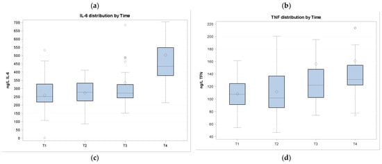 In the figure, cytokines and APP quantifications are shown at different sampling times. Data are normalized. (a) APTO (haptoglobin) distribution by time; (b) SAA (serum amyloid) distribution by time; (c) IL-6 (interleukin-6) distribution by time; (d) TNF (tumor necrosis factor α) distribution by time.