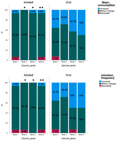 At week 1, the perceptions of the owners of 35.7% of the dogs from this group were that water consumption and urinary frequency increased compared to the inclusion point (Figure 3). This percentage was reduced at week 2 (28.5%) but again increased at weeks 3 (42.9% for water consumption, 50% for urinary frequency) and 4 (50%). These changes were not significant according to between-control point statistical comparisons.