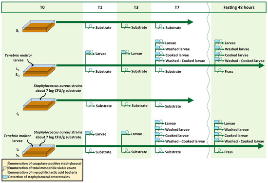Tenebrio molitor larvae were reared at the Department of Veterinary Sciences of the University of Pisa, in plastic crates of 39 × 28 × 14 cm. The farming temperature was set to 25 °C (±1) with a relative humidity range of 55–65%. The larvae were fed a mix of 1:1 spent brewery grains and bread leftover (dry matter, DM: 97.08%; ether extract: 2.26% of DM; crude protein: 14.20% of DM; ash: 2.47% of DM). The last instar larvae were sieved and fasted for two days before starting the trial. Larvae and substrates were previously analysed to determine, as described in Section 2.3, the initial count of coagulase-positive staphylococci (CoPS), that resulted under the detection limit, and to check the load of total mesophilic viable count (TVC) and total mesophilic lactic acid bacteria (LAB) before the beginning of the trial (T0). Larvae were also tested for staphylococcal enterotoxins at T0 (see Section 2.4) giving negative results. A detailed description of the experimental design can be found in Figure 1. Four different sets of crates (in triplicate) were employed as only control substrate (SC, spent brewery grains: bread leftovers, 1:1), only S. aureus inoculated substrate (SI), control substrate with larvae (named as SCL for the substrate, and LC for the larvae), and S. aureus inoculated substrate with larvae (named SIL for the substrate and LI for the larvae). The ratio of substrate–larvae was 5:1. Where needed, (SI and SIL) the rearing substrate was experimentally inoculated with an inoculum composed of two strains of S. aureus (see section below). Samples of larvae and substrates were collected after 1, 3, and 7 days (T1, T3, and T7) to determine the microbiological loads of CoPS, TVC, and LAB, and limited to larvae samples, the production of staphylococcal enterotoxins. Furthermore, the effects of fasting, washing, and cooking were tested (on day 7) performing the same analyses described above. Fasting was conducted for 48 h in sterile plastic containers with a net as the base to avoid faecal contact and the frass was collected in a second sterile plastic container placed below. Washing was performed in sterile bags with sterile saline solution (9:1, v/w). Bags were manually shaken for 3 min, then the washing solution was removed by pipetting and collected. Lastly, larvae were cooked in a preheated oven at 150 °C for 10 min in aluminium trays.