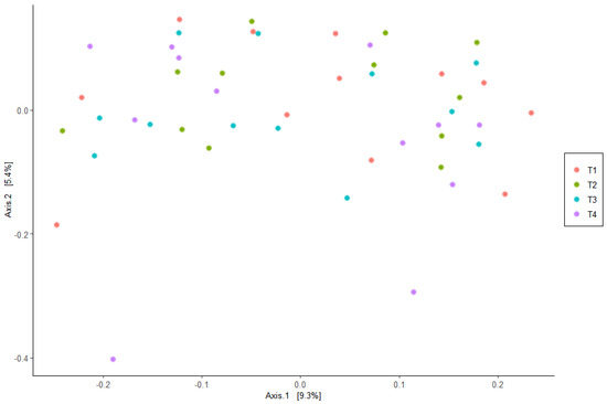 Principal coordinate analysis (PCoA) explaining 9.3% and 5.4% of the variability in operational taxonomic units (OTUs) of Bray–Curtis UniFrac distances for fecal samples from the dogs fed the dietary treatments. Treatments: T1 = control; T2 = brewer’s dried yeast; T3 = brewer’s dried yeast and distiller’s dried grains with solubles; T4 = corn-fermented protein.