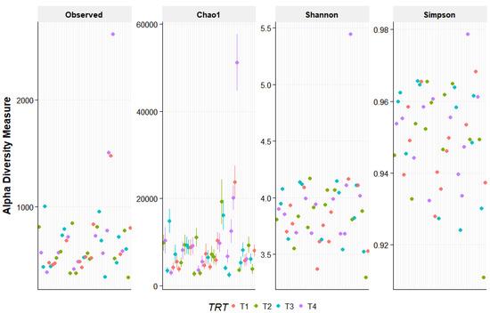 Alpha diversity measures for fecal samples from the dogs fed the dietary treatments. Treatments: T1 = control; T2 = brewer’s dried yeast; T3 = brewer’s dried yeast and distiller’s dried grains with solubles; T4 = corn-fermented protein.